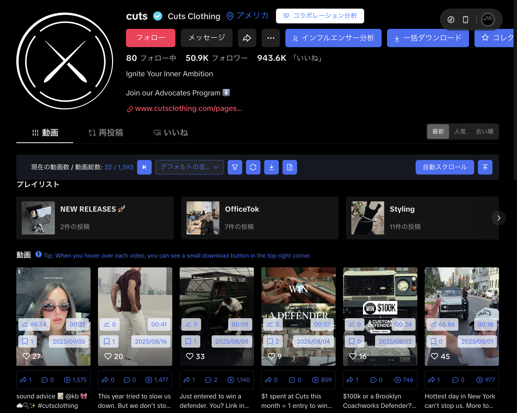 TikTok公式アカウント(@cutsclothing)では、日常の着こなし提案・新商品の紹介・ユーザー質問への回答などを通じて、ブランドと消費者の距離を縮めています。